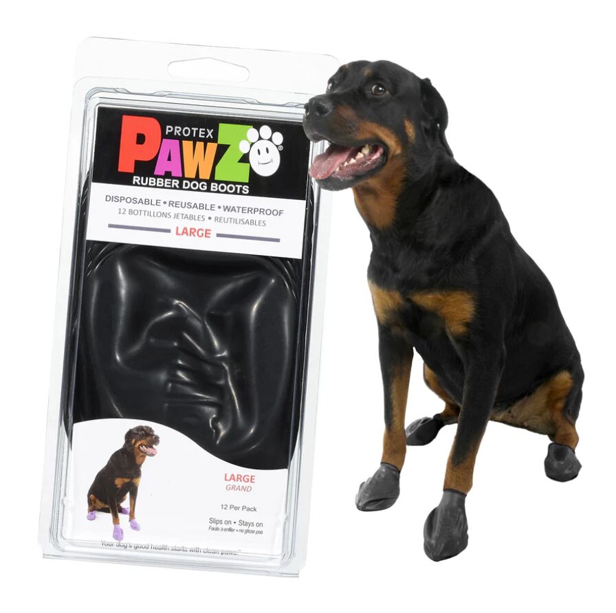 PawZ Rubber Dog Boots Large σε μαύρο χρώμα. Λαστιχένια παπουτσάκια σκύλου για προστασία πατουσών από ζέστη, κρύο, λάσπη και αλάτι. Για πατούσες 7.5cm έως 10cm. Συσκευασία 12 τεμαχίων. 🐕🖤