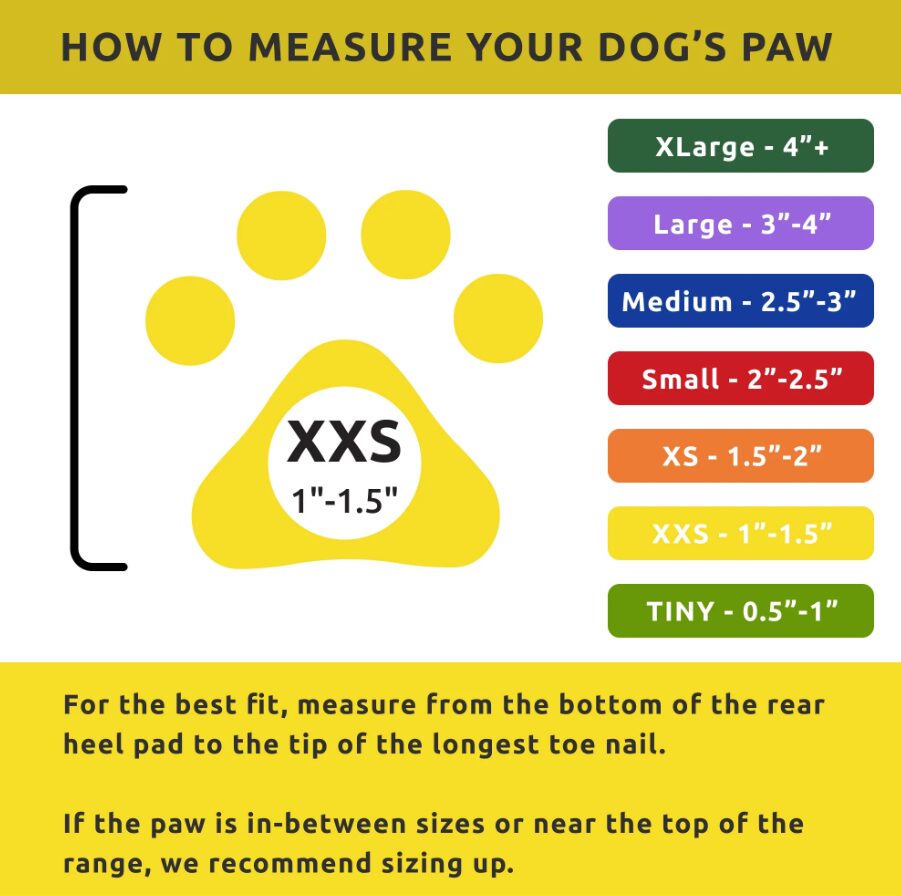Προστατεύουν αποτελεσματικά από καυτό οδόστρωμα, παγωμένες επιφάνειες, χιόνι, λάσπη, αλάτι και χημικά, μειώνοντας τον κίνδυνο ερεθισμών και τραυματισμών. Το μέγεθος XXSmall είναι ιδανικό για πατούσες 2,5 έως 3,83 cm, ενώ το κίτρινο χρώμα προσφέρει αυξημένη ορατότητα και ασφάλεια κατά τη βόλτα.
